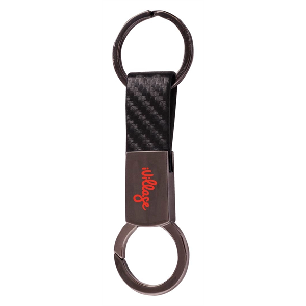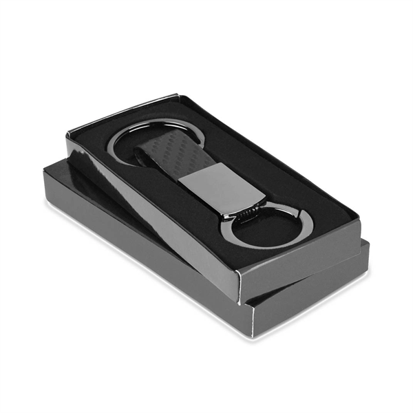 Measuring 1 1/4" x 4", this keychain features a durable metal alloy body paired with a black faux leather strap in a woven-style design. The combination of polished metal and textured leather creates a modern, upscale look that's perfect for branding. Ideal for giveaways, corporate gifts, or promotional events, this keychain keeps your logo stylishly in hand.