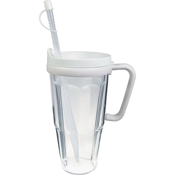 USA MADE Acrylic Plastic Double Wall Insulated Travel Mug with Handle, Lid & Straw in 14, 16 & 24 oz sizes. Lifetime Guarantee. Your permanent imprint sealed between the walls. Prices include a 1 color imprint on 1 side. Multi-color, 2nd side, full wrap and full color imprint available at an additional charge. 4 other decoration options available. Also available as a Travel Tumbler w/ lid & straw or Travel Mug w/handle, lid & straw all in 14, 16 & 24 oz. sizes. Gift and shipper boxes available for most sizes, call for availability and prices. Top rack dishwasher safe, BPA free, FDA approved, CPSIA & Prop 65 compliant.