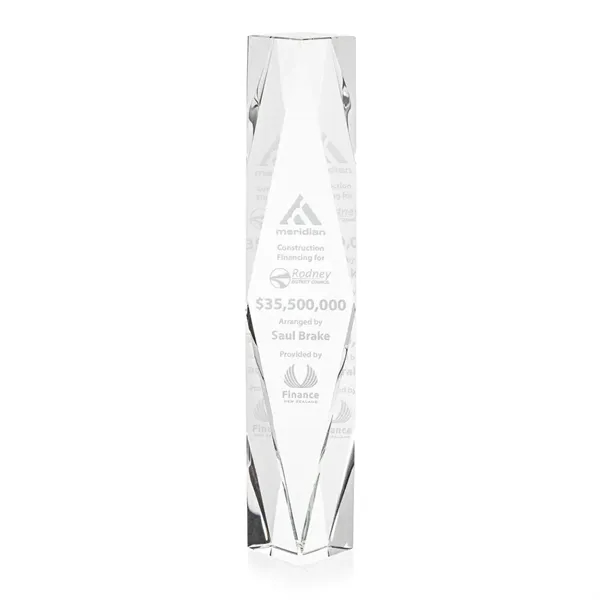 The striking freestanding optical crystal Toscana Award showcases a grand diamond at its center, surrounded by swirling ripples that create a sense of movement and elegance. It's a captivating piece, perfect for celebrating a true leader.