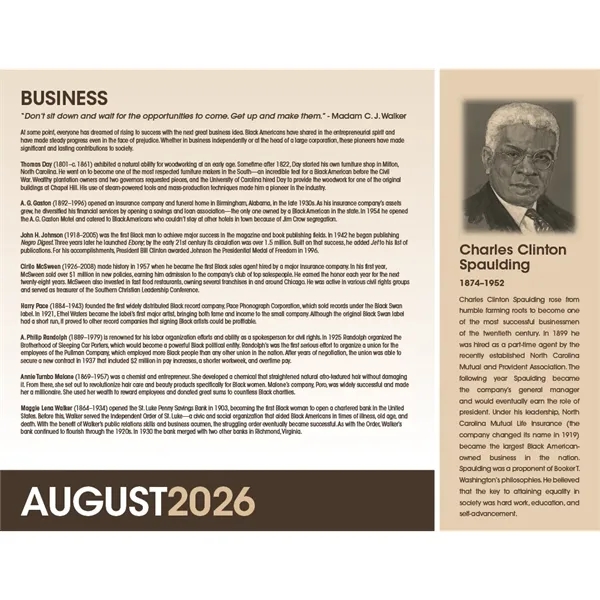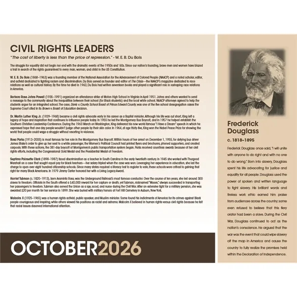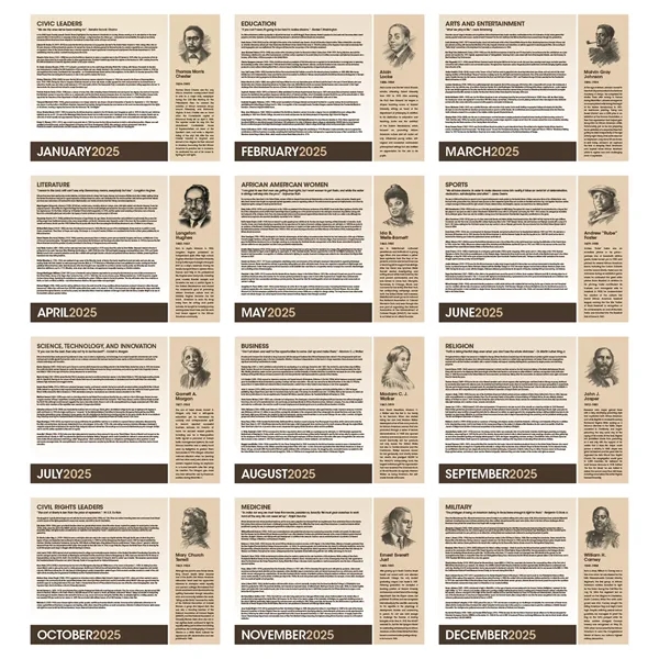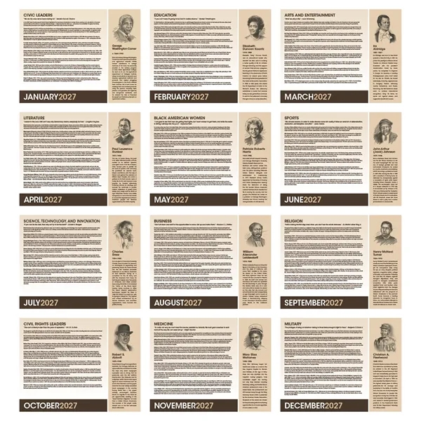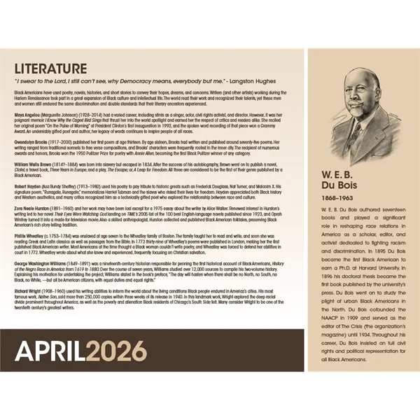 Celebrate the accomplishments of African Americans with this detailed, educational calendar. Every date highlights an event in Black history, and monthly bios delve deeper into the fascinating lives of some of America’s most prominent African Americans. The FSC® label means that the materials used for this product come from well-managed FSC®-certified forests and other controlled sources.