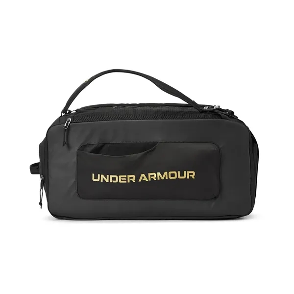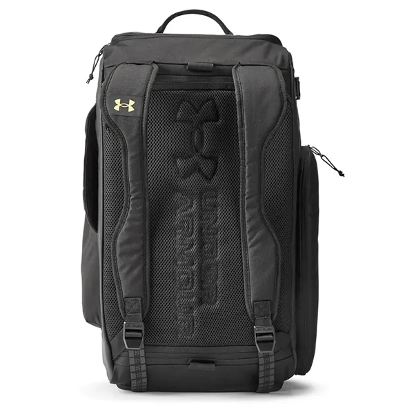 Crafted from 100% polyester, this versatile bag features UA Storm technology, providing a highly water-repellent finish. The padded airmesh back panel and PU-coated body fabric ensure ultimate durability and breathability. The large, vented main compartment offers internal organization for a laptop, tablet, and valuables, with a soft-lined laptop sleeve that accommodates up to a 15" laptop. It also includes a dual-direction, extra-deep water bottle pocket, two exterior valuables pockets, and a gusseted laundry/shoe pocket at the bottom. Welded hypalon modern molle webbing provides additional attachment points. This bag can be used as both a backpack and a duffle, with a removable duffle strap. It measures 12.4" W x 10.5" H x 23" L and is deco eligible for customization.
