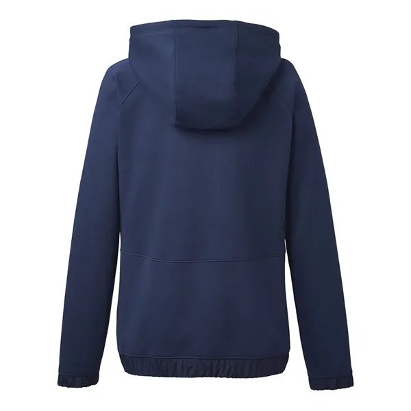 Under Armour Women’s Hustle Full-Zip Hooded Sweatshirt ul)80/20 cotton/polyester. Ultra-soft, mid-weight performance cotton with brushed interior. Four-way stretch construction. Moisture-management properties. Mesh-lined three-piece hood. Raglan sleeves. Encased elastic cuffs. Open hand pockets. Encased elastic bottom hem.
