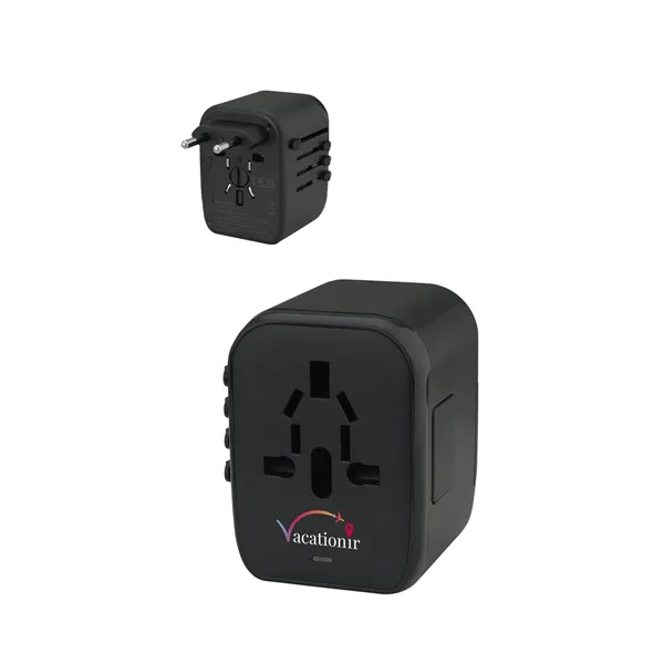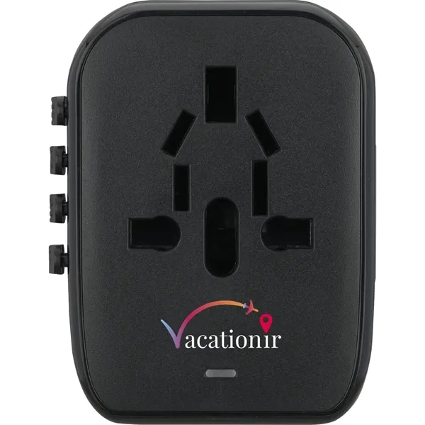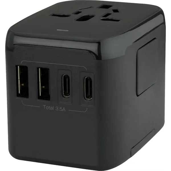 Fits most international plugs and wall sockets in 150+ countries Adapter allows for powering/charging of 5 devices at once (1 AC power socket, 2 USB-A and 2 Type-C charging ports) Features 4 AC power plugs - EU, UK, USA, and AUS Features 2 smart Type-C ports - 2.4A maximum output per port Features 2 smart USB-A ports - 3A maximum output per port Input voltage: 100-250V (Does not covert voltage) Maximum load: 8A Power rating: 100-250V-8A MAX Removable, replaceable spare 8A fuse Blue LED light indicator when in use Side button releases safe-lock feature