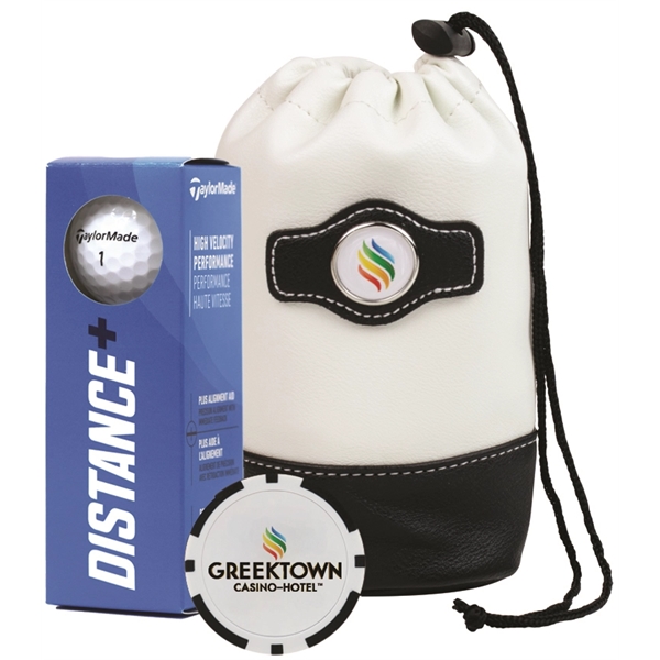 For the value golfer, this golf kit includes three Taylormade Distance Plus golf balls, a poker chip ball marker, packaged in a synthetic leather valuables pouch. Price includes a full color imprint on the golf balls, poker chip and pouch.