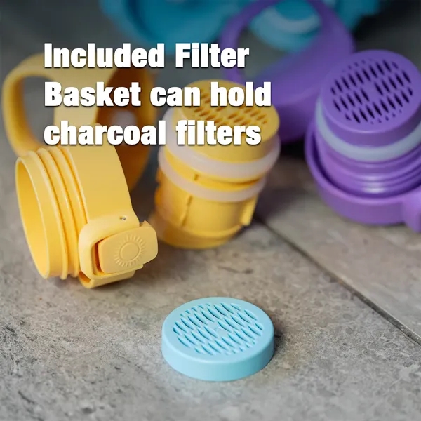 Vapur’s Chill bottle in Sunbeam Yellow is equipped with an easy to use lid lock for zero leaks or spills and an EZ Flow cap with flexible spout positioning. Double wall insulation keeps beverages cold for 12 hours and beverages hot for 8 hours. Comes with a convenient clip, making it easy to attach to your purse, belt loop or pack. Dishwasher Safe with removable spout for optimum cleaning. Includes a filter basket that can fit charcoal filters for clean, great tasting water. Laser engraved. Boxed. Also available in Dusk Purple (#10326), Admiral Blue (#30181), & Seaside Blue (#10327).