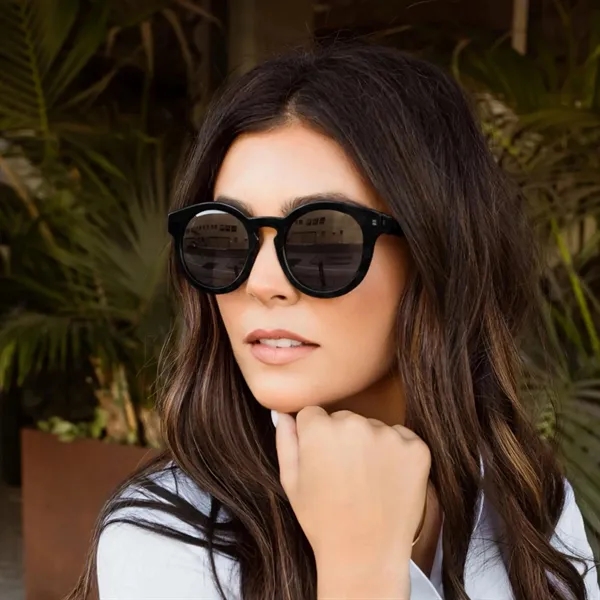 Bold style meets smart design in these Quinn women's sunglasses. With a classic round silhouette, oversized keyhole, and angular temples, these handcrafted frames - made from Italian Mazzucchelli Acetate - bring a modern edge. Designed in California, they feature flat nylon CR-39 polarized lenses that offer 100% UVA/UVB protection, reduce glare, and resist scratches. Built for durability and comfort with 5-barrel hinges, they’re a standout choice for everyday elegance.