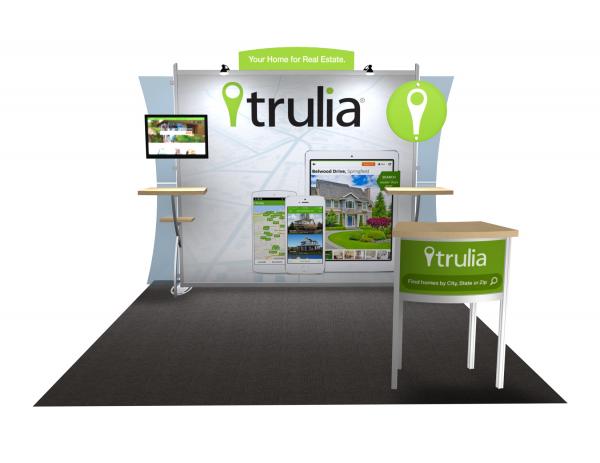The affordable Sacagawea Portable Hybrid is a contemporary display designed with lightweight engineered aluminum and vibrant tension fabric graphics. Using knob-assisted assembly, the Sacagawea sets-up quickly, typically in less than 40 minutes for a 10 ft. display. All components are individually numbered and pack in durable roto-molded cases with custom die-cut foam packaging. Options include workstations, pedestals, fabric canopies, headers, iPad accessories, and monitors.