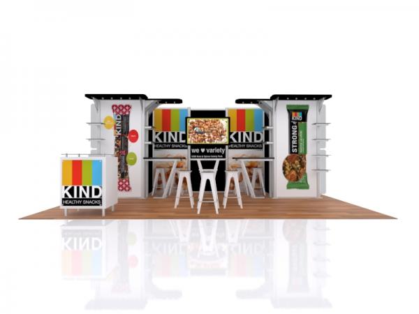 When it comes to tradeshow marketing, what matters is your message. The VK-1327, VK-2969, and VK-5129 displays are message-centric designs. They feature bold branding in layers and in heights, all designed to focus attention on your company. The island design has three towers with shelving and peninsula counters. The open design is ideal “as is” or as a starting point for an exhibitor that has larger products to show in the booth space. The Island can be reconfigured to a 10 ft. or 20 ft. inline. The graphics are segmented to work seamlessly in any of the configurations, saving you the expense of additional graphics.