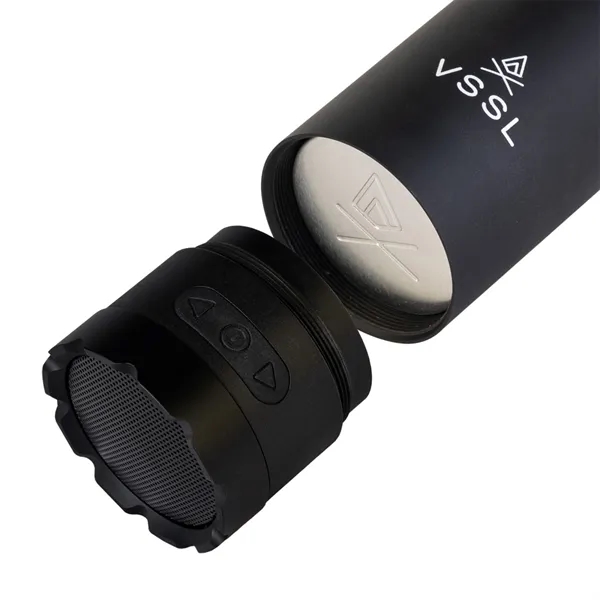 Enjoy the sounds of your favorite music, podcasts, audiobooks and more almost anywhere you are with this wireless mini speaker that works with the VSSL camping gear system. Made of machined military grade aluminum, this 2" Speaqua Bluetooth(R) wireless speaker is water resistant with a low profile, a split flip carabiner and a magnetic closure. This device fits into any VSSL cylinder holder and includes retail packaging. Available in black. Add your logo or message to customize.