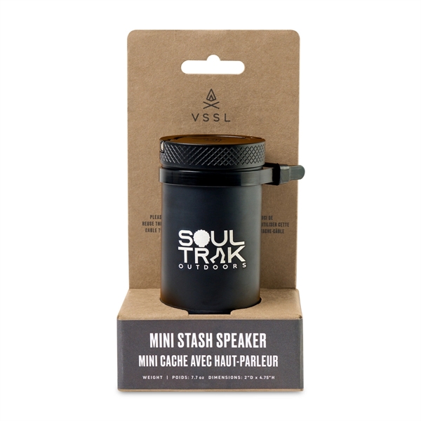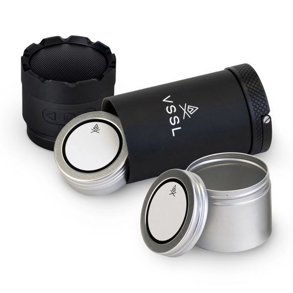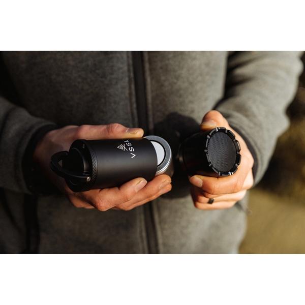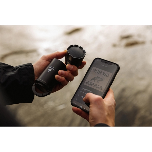 Enjoy the sounds of your favorite music, podcasts, audiobooks and more almost anywhere you are with this wireless mini speaker that works with the VSSL camping gear system. Made of machined military grade aluminum, this 2″ Speaqua Bluetooth(R) wireless speaker is water resistant with a low profile, a split flip carabiner and a magnetic closure. This device fits into any VSSL cylinder holder and includes retail packaging. Available in black. Add your logo or message to customize.