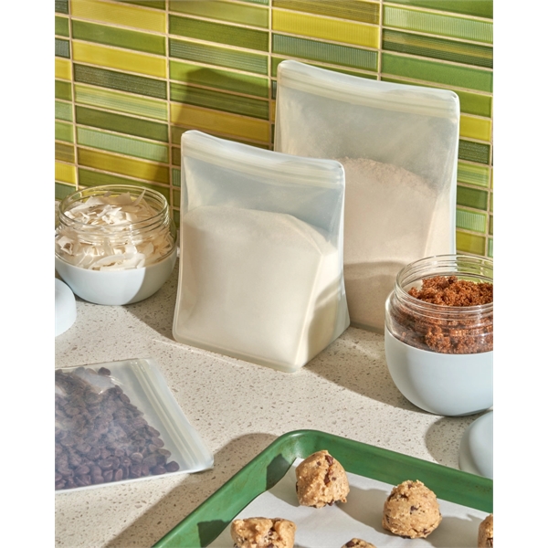 This set of reusable Stand-Up Porter Bags includes a 36 oz and 50 oz size to cover all your food storage needs... and more! Each bag is made from one piece of 100% LFGB-certified silicone with no chemicals, glues, or adhesives. The Stand-Up Bag is easy to load, unload, and store upright. Flip the bags inside-out to hand-wash or throw it in the dishwasher and with its curved corners there's nowhere for pesky buildup to hide. T