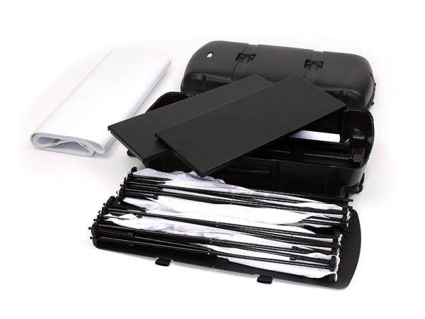 The Xpressions Express makes it easy to display on the go because packed in one durable rolling case is an entire display. To assemble simply unpack the Xpressions SNAP units, link them with two shelves or graphic skins. The case quickly transforms into a podium with a huge graphic for maximum branding and a cubby for spacious storage.